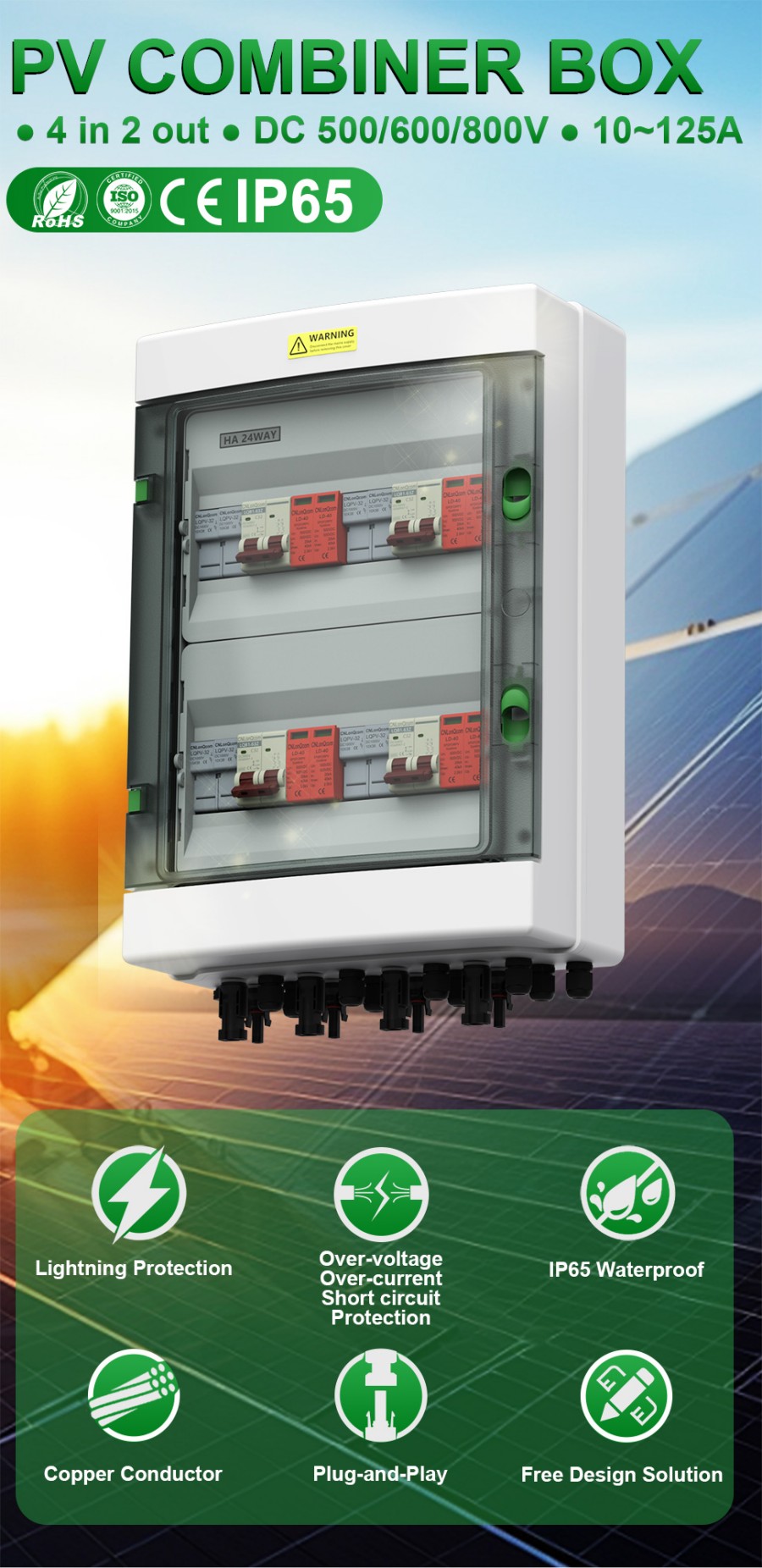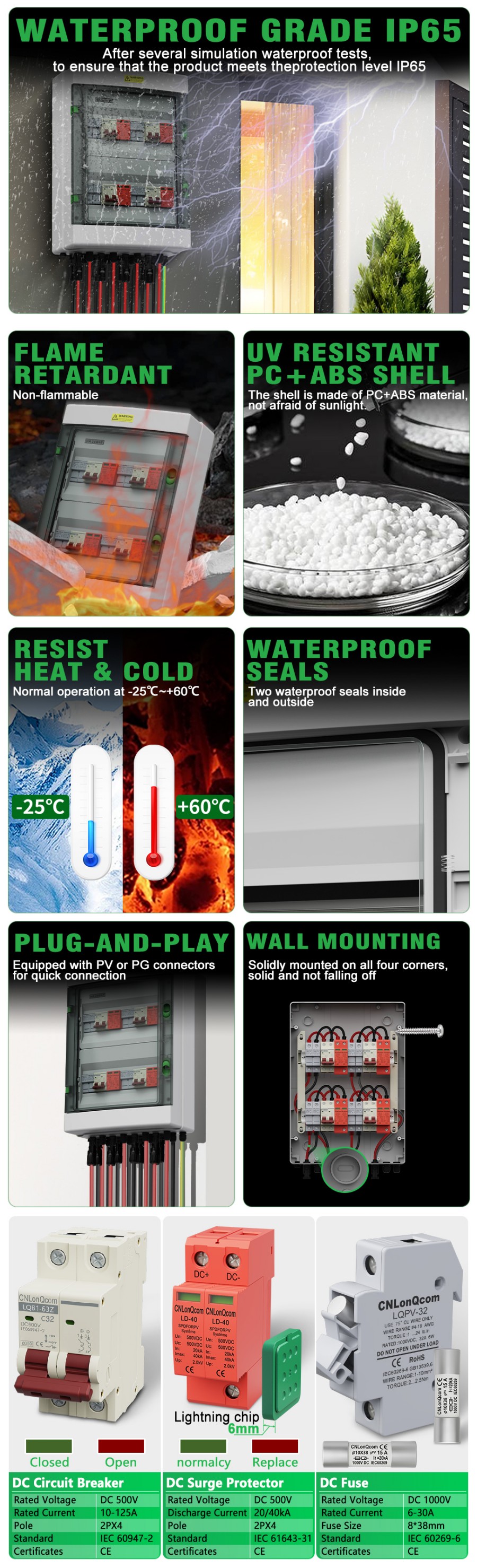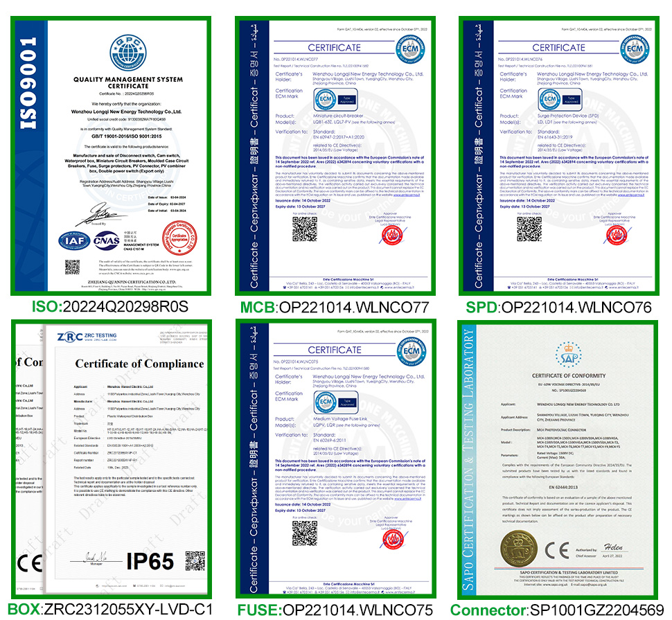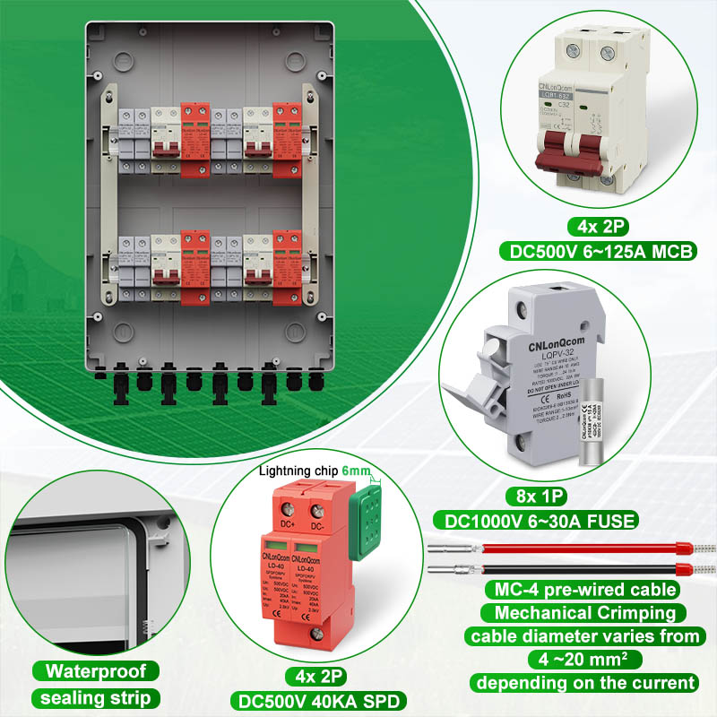 CNLONQCOM's CNLONCOMCOM PV COMPINE PV 4 ໃນ 4 ອອກ DC500V / 600V / 800V ສ່ວນໃຫຍ່ແມ່ນໃຊ້ໃນການປ້ອງກັນລະບົບ PV ແລະມັກຖືກໃຊ້ໃນລະບົບທີ່ມີຕາຂ່າຍໄຟຟ້າ. ເຊັ່ນດຽວກັບແຜງ PV, RV, ເຮືອ, ທາງນອກ PV, ຄົວເຮືອນ, ແລະອື່ນໆ.